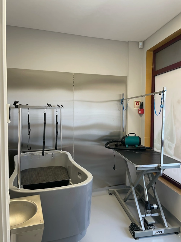 Serviço de banhos e tosquias que inclui secagem e escovagem do pêlo, corte de unhas e limpeza de ouvidos e dos olhos.